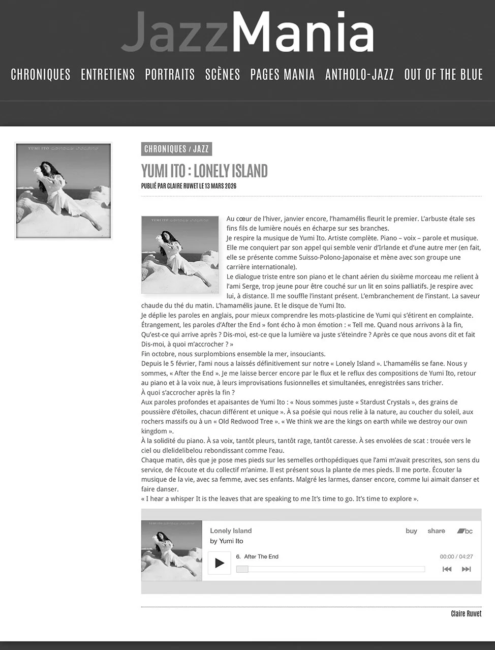 “Lonely Island is probably Yumi Ito's bravest album yet: she challenges herself to let go of every protection, every safe arrangement, to stick with the essential. And this doesn't mean facile simplicity, but rather the revelation of what's truly needed: a melody that holds, a voice that exposes, a piano that accompanies without covering.”